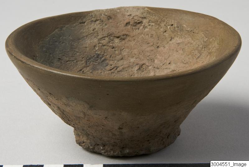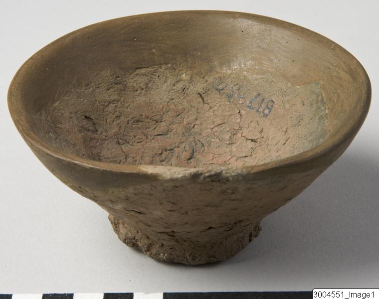- A small open bowl with a flaring profile, raised base and a rounded rim. Grey red ware, eroded. Rim reconstructed.