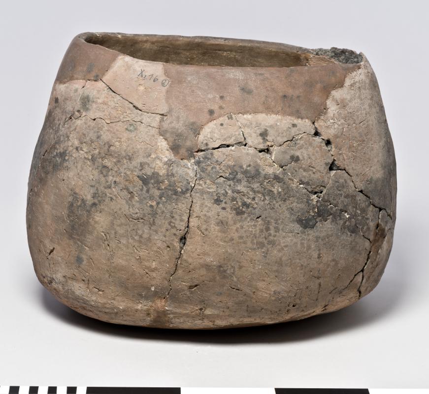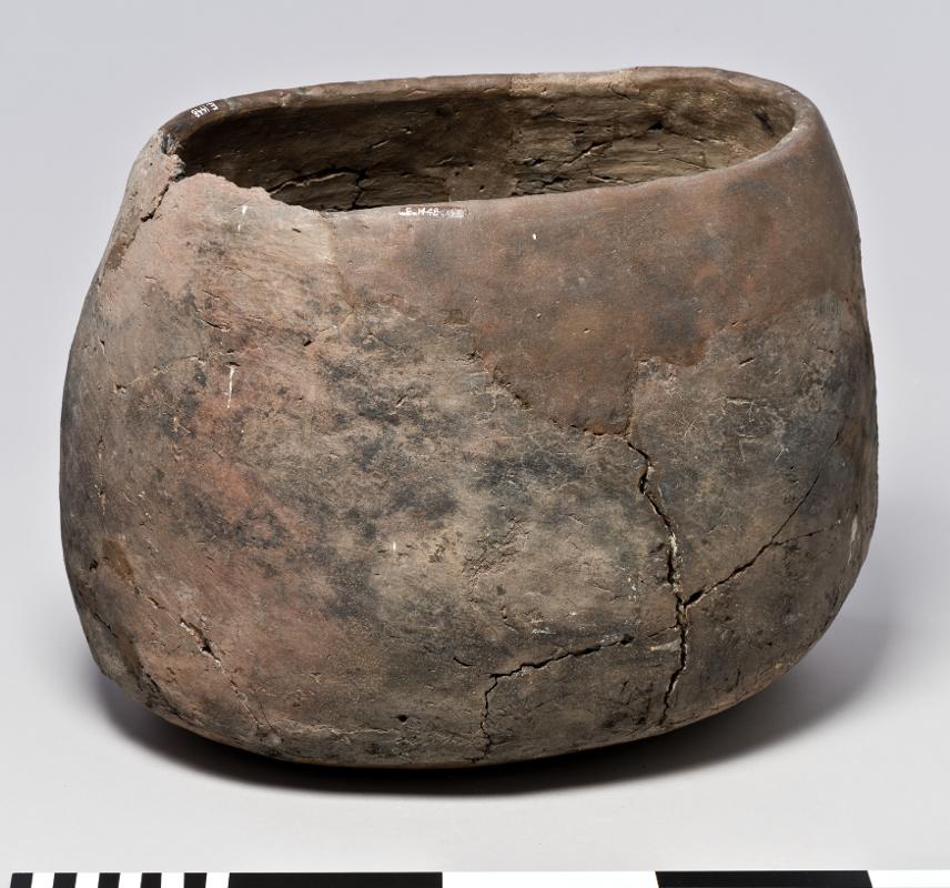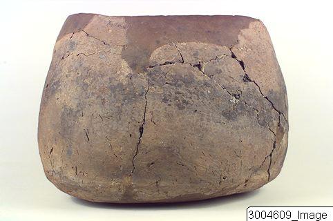 - Large vessel with a converging profile, oval mouth, flat base and rounded rim. Brown ware, smoothed.