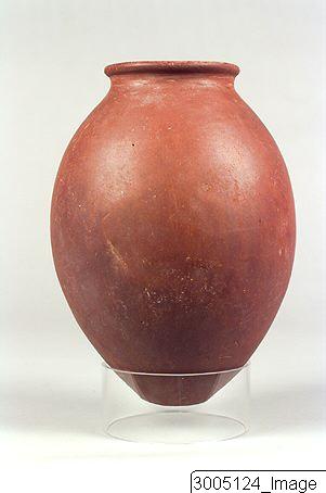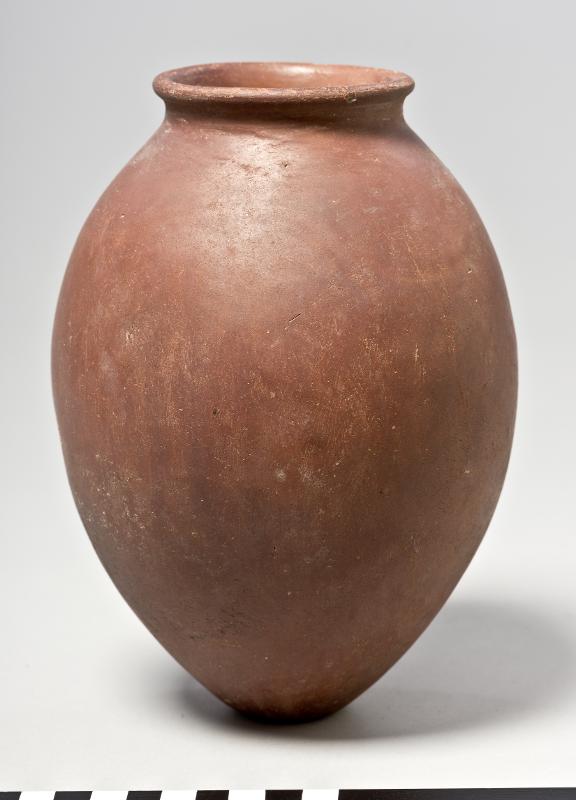- A necked jar with an ovoid body, modelled rim and tapering to a narrow, flat base. Polished interior rim.