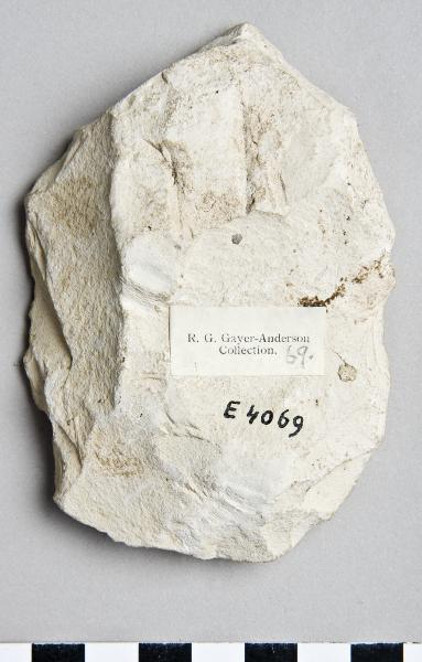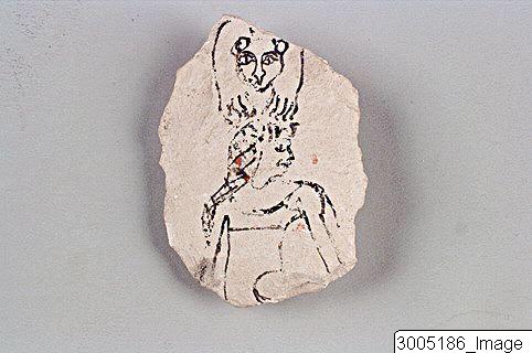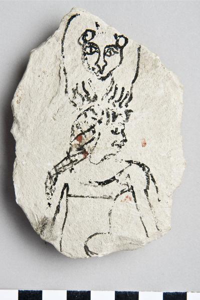 - Ostracon, rectangular, the sketch in black,with occasional red spots, is damaged. At the top, the face of an animal, shown en face dominates. It has small, round ears and is surrounded by two paws. Beneath the animal, there is a royal person, with an uraeus on the forehead and a peculiar wig in what looks like some kind of net. he is wearing a collar and a garment ending by the armpits. The hands and the lower body are missing. Limestone.