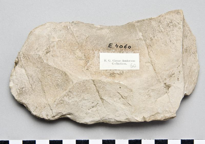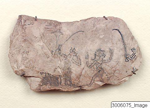 Ostracon, irregularly shaped. Sketch on one side with details outlined in black. Two cats on their hind legs, facing each other, with sticks in the paws, are surrounding a naked human which is defecating. The cats are hitting the human with the sticks. The right hand cat is fragmentary, only the front paws are visible. The human person is naked except for some decorative ribbons around the upper body. The hair is tied in tails. To the left is a podium with a faint pillar and a canopy or some kind of cover.