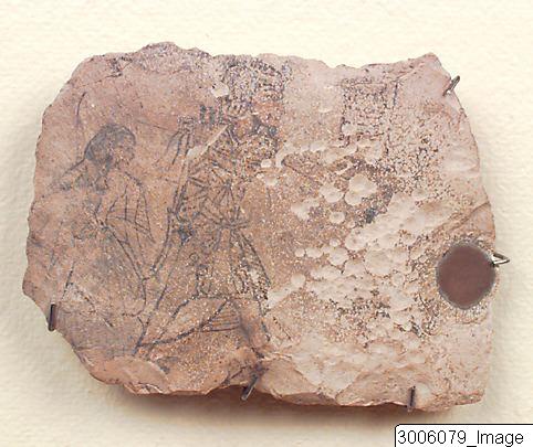 Ostracon, evenly rectangular. On one side small flint inclusion, on this side a sketch in red and black. It shows a king and a servant. The king is in the middle of the sketch, outlined in black and with the face coloured red. He is wearing a short wig and a uraeus and headband. He is wearing a shirt which is covering the upper part of his upper body and which is tied around his waist. It has short sleeves and looks spotted, possibly a leopard skin? The king is also wearing a short kilt, decorated with sun discs and uraeus. He is wearing bracelets. Above the left arm are traces of an inscription. The second man is also facing right. He is dressed in a wide, pleated garment and a black wig. He is carrying over his shoulder a bow and a sword or an axe. He is shorter than the king.