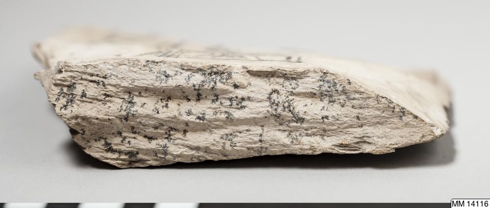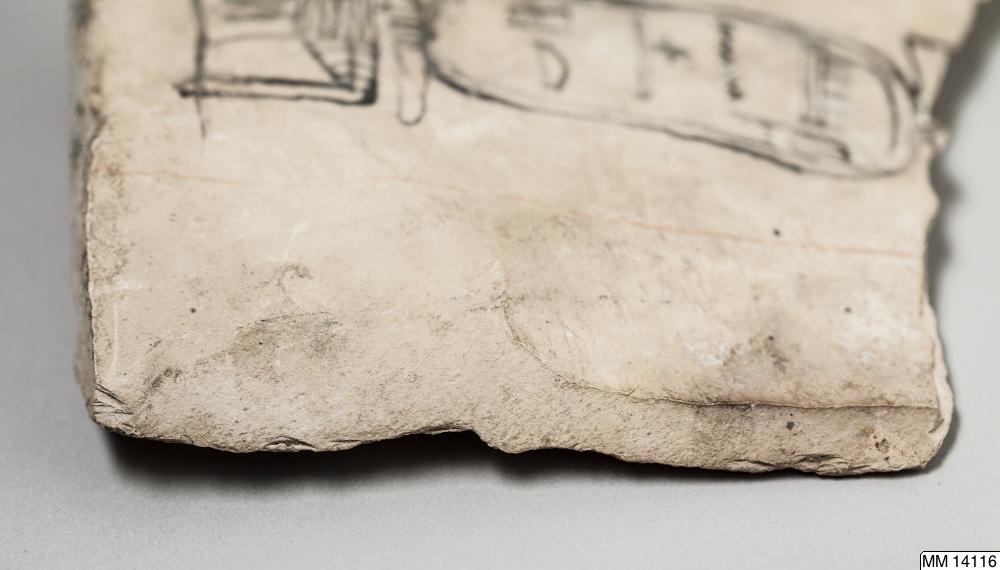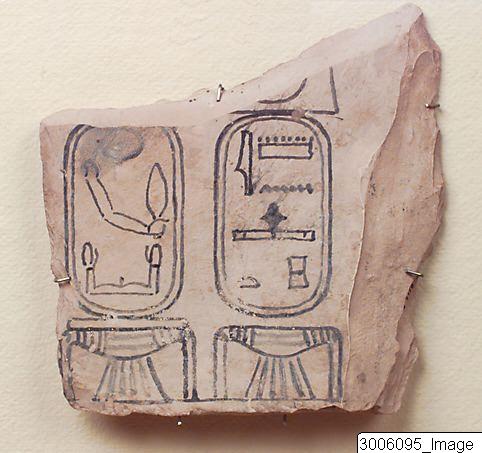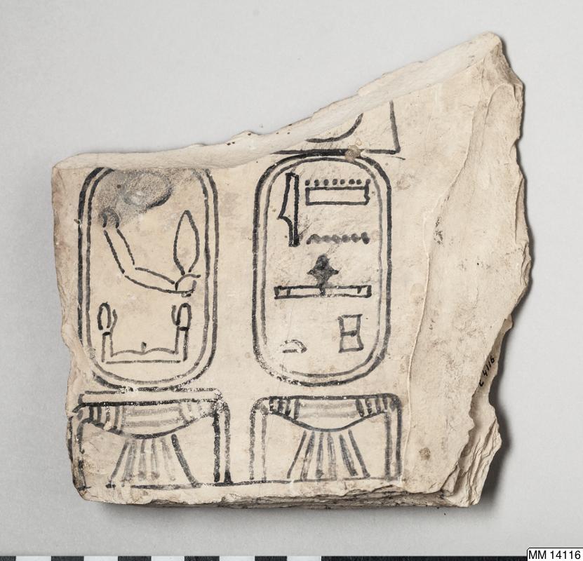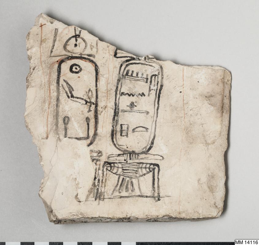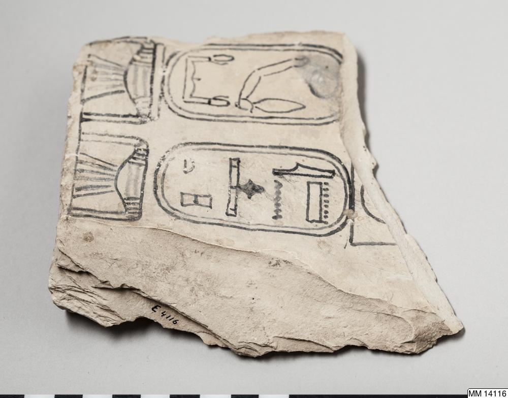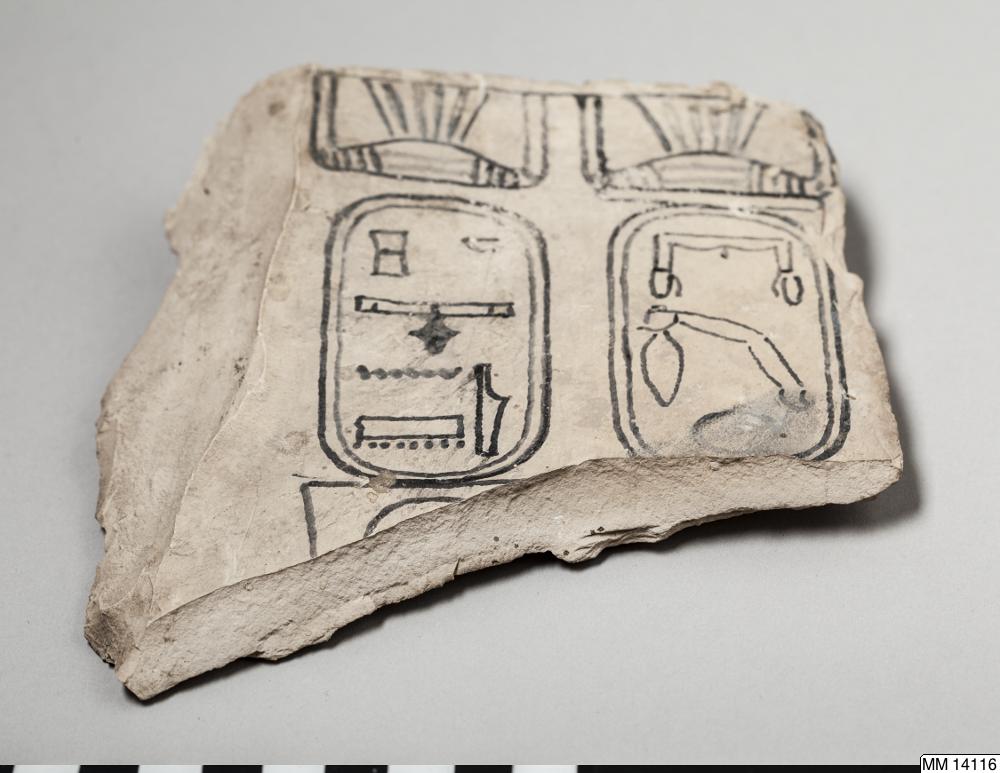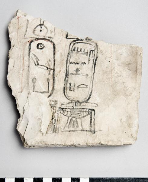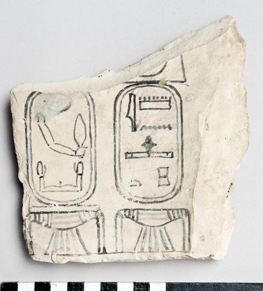Ostracon, irregularly shaped. Sketches on two sides in black and red, damaged. On one side are two cartouches next to each other. The inscription in the right hand one is the name of Amenhotep I. On the other side are also two cartouches with the same names as in those on the recto. This sketch is of poorer quality than the one on the recto.