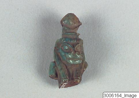 - Amulet. Thoeris, fragmentary. Only the head and the upper body preserved. She is wearing a sun disc and horns. Threading hole at the back of the head.