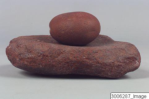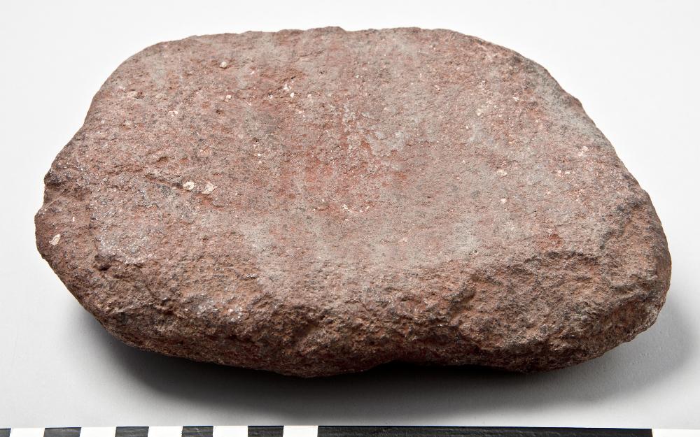 - Saddle quern, part of hand mill. Smooth, slightly concave upper surface. Red sandstone.