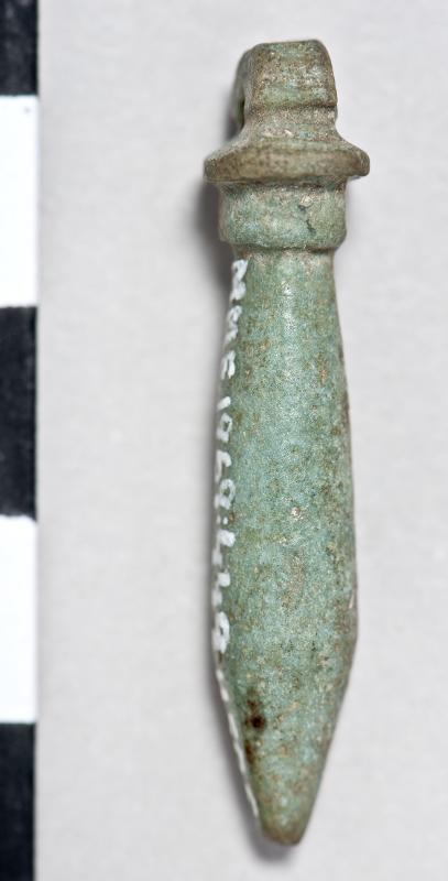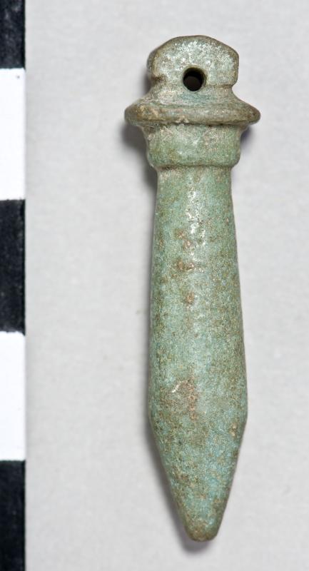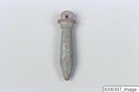 - Shaped in the round, shaft widening towards the lower, pointed end. Defined, incised leaves, opening, spreading head with suspension loop at the top.