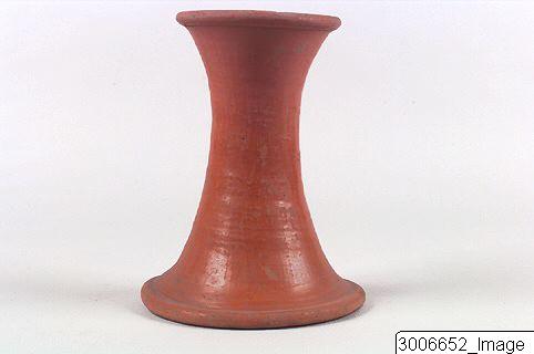 - A tall pottery stand with a converging lower body which transcends to a flaring upper body and ends in a modelled rim. Red surface with an exterior decoration in maroon. It features vertical red lines.
