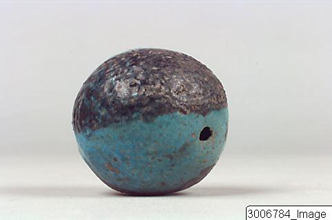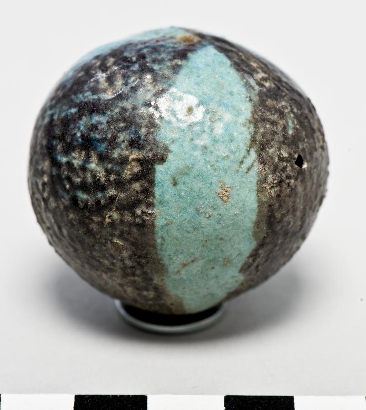 - Hollow ball with three threading holes, two opposite each other. Turquoise faience with three black stripes.