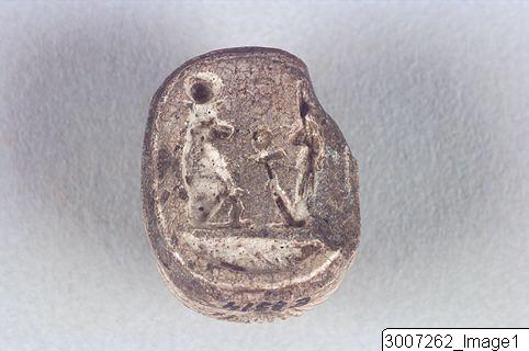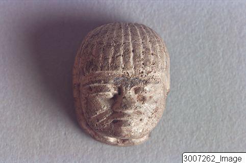 - Scaraboid in the shape of a human head. The hair formed by parallel incised lines. Seemingly wearing a moustache, hence indicating this being a Patek. Threading hole running though the piece from neck to the top of the head. The verso has 2 incised, seated gods, the baboon of Thot wearing a sun disc, and the goddess Maat with a feather on her head and an ankh sign on her lap.