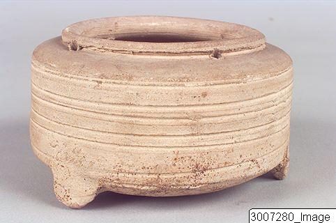 - A small cylindrical container standing on four small feet, it has an applied rim, restricted mouth and four threading holes adjacent to the rim. The body is encircled by incised lines.