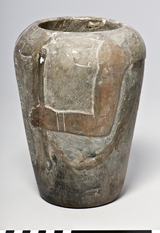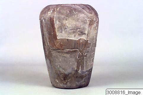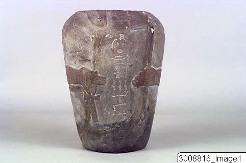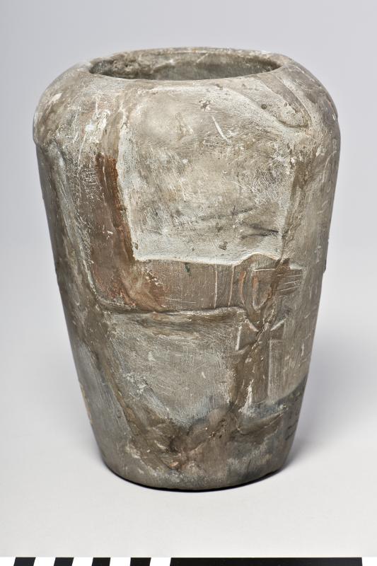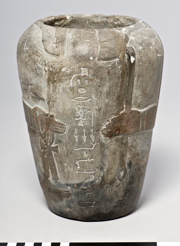 - A canopic jar for the man, Sedmenet featuring two arms, holding an ankh sign and a sceptre. One vertical row of hieroglyphic inscription. It has no accompanying lid.