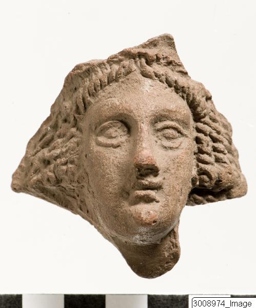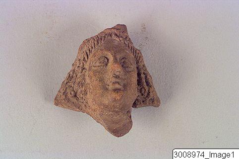 - Head of figurine, woman. Moulded. Hair in braids. Large nose, well defined eyes and mouth.