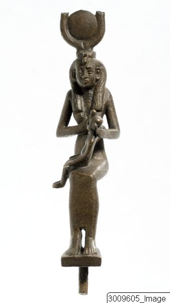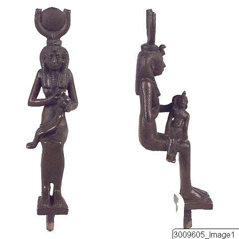 - A sitting Isis with fragmentary horns, uraeus and sun’s disc and Horus on her lap.