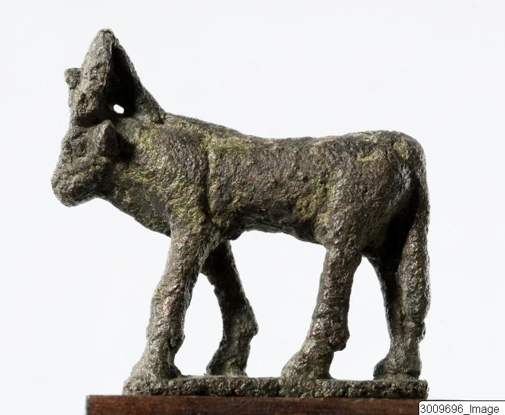 A statuette of an Apis bull. It is wearing a crown of sun’s disc flanked by horns. Uraeus on its brow.