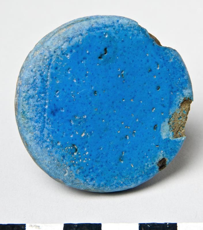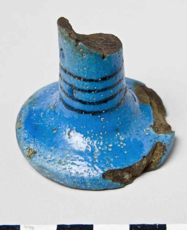 - The foot from a wine glass. Round bottom. Part of neck remaining, decorated with four lines in black.