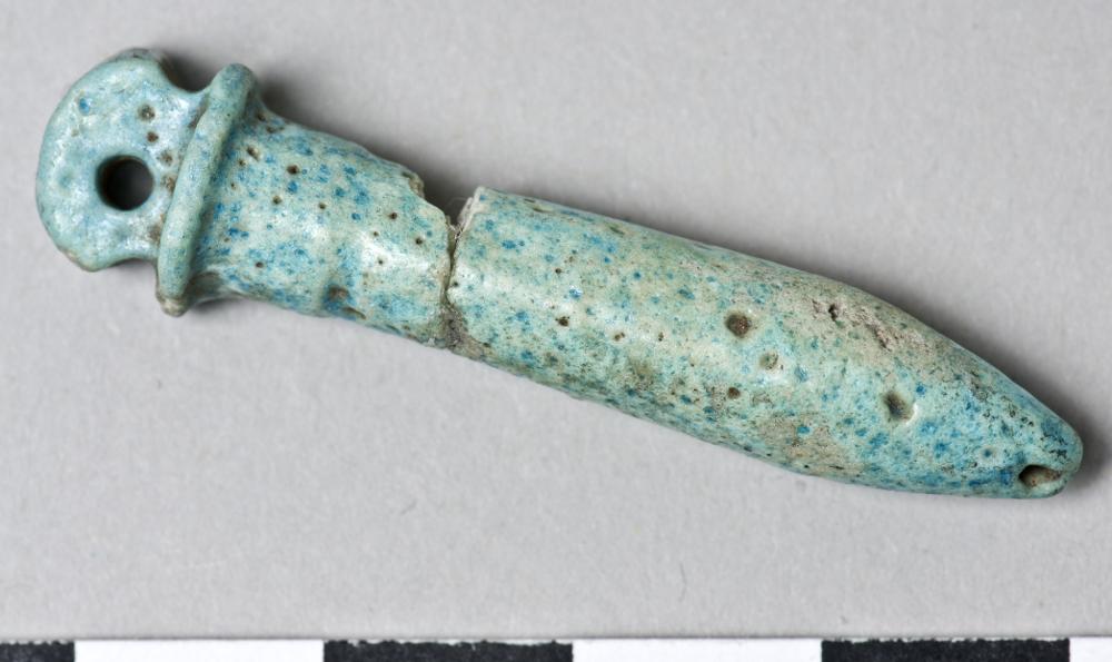 - A wadj pillar (papyrus column) in the round, no decoration. On top a suspension loop. Broken and repaired, chipped top rim. Bright blue glaze.