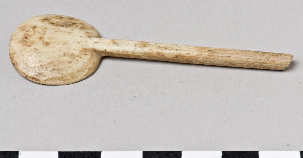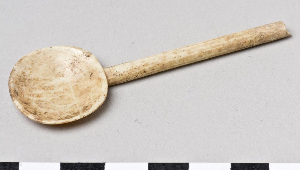 - A spoon carved in one piece. Handle broken. The spoon is concave and almost round in its shape. No decoration.