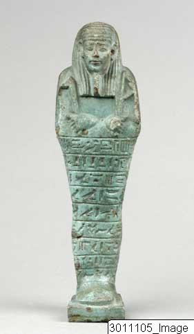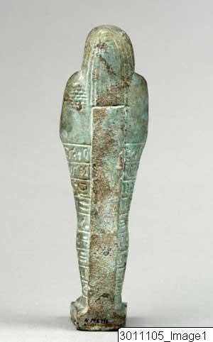 - Ushebti figure with horizontal inscription. Made for the priest Henat, son of Tayu. Bluegreen faience.