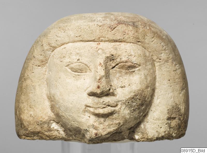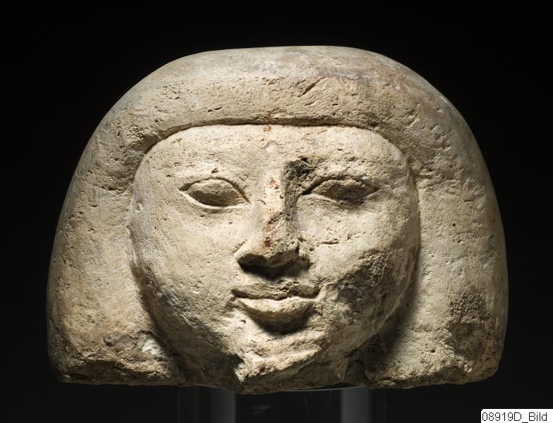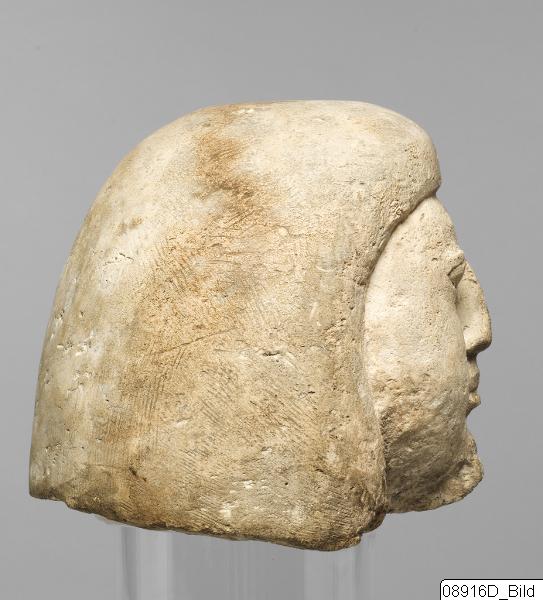 - Male head. Rounded, broad face. Sharp fringe. A tross of hair is hanging down on each side.