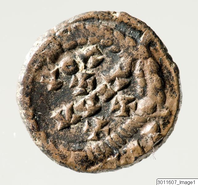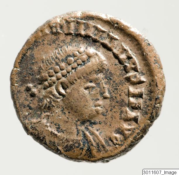 - A coin with an image of the emperor Valentinianus II and the text (DN VALEN) TINIANV PFAVG. On the other side a garland and the text VOT X MVLTXX AAEF (Alexandria).