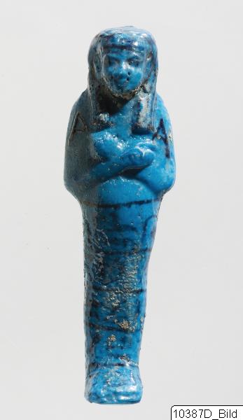 - An inscribed ushebti with four (or five?) horizontal lines in front. Painted dorsal column. Basket painted at back. Bright blue glaze. Made for hm-ntr n jmn.