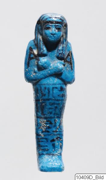 - An inscribed ushebti with four horizontal lines in front. Painted dorsal column. Basket painted at back and yoke at shoulders. Bright blue glaze.