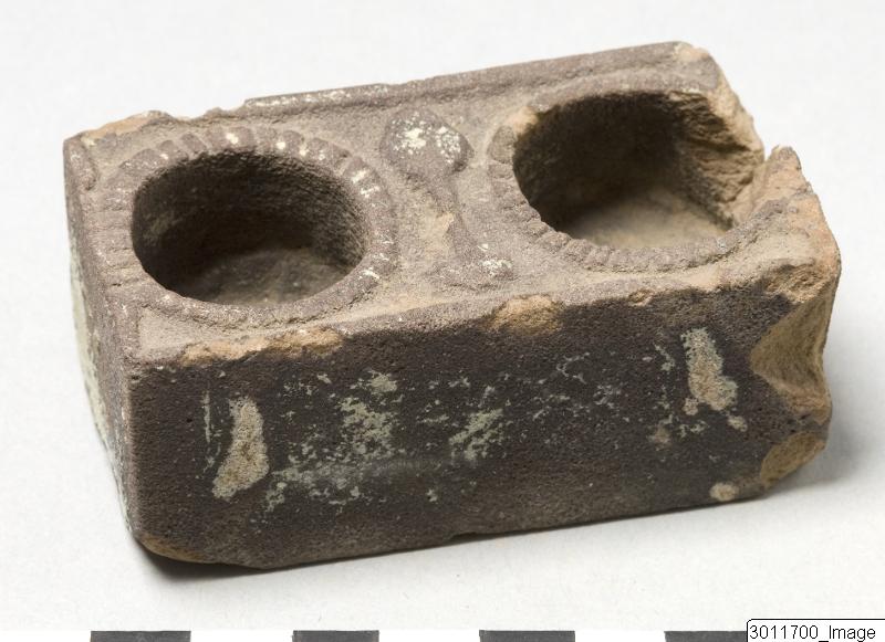 - Rectangular inkhorn with two round basins. On top decorated with nefer sign and around holes dendrils(?).