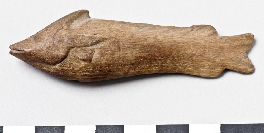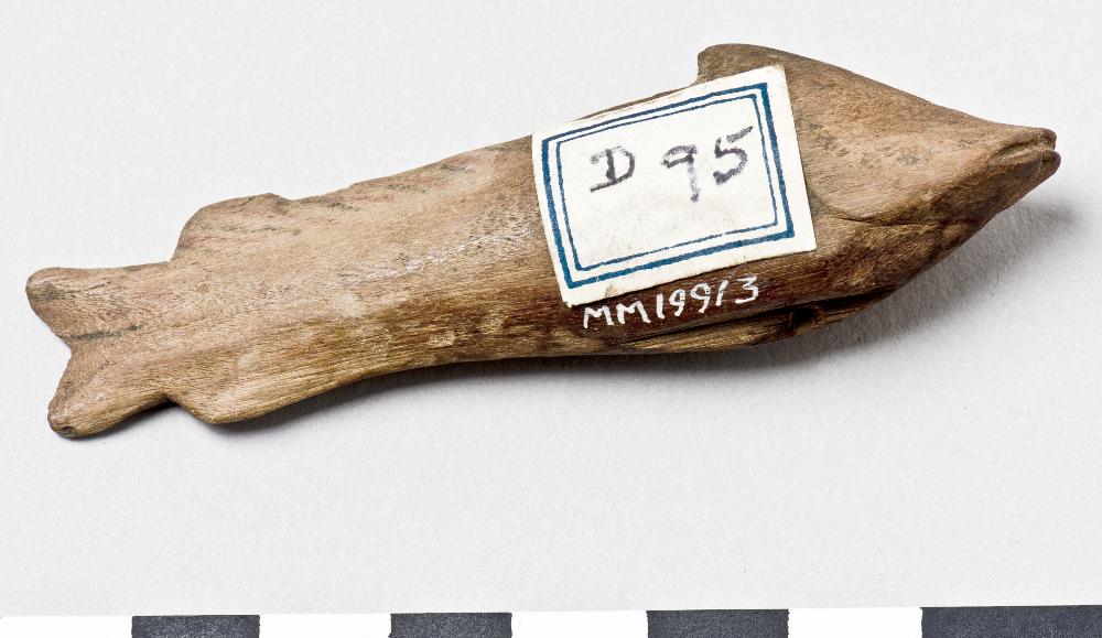 - Carved fish. Faint traces of black paint on the body. A hole under the fish for holding a peg. Part of a model?