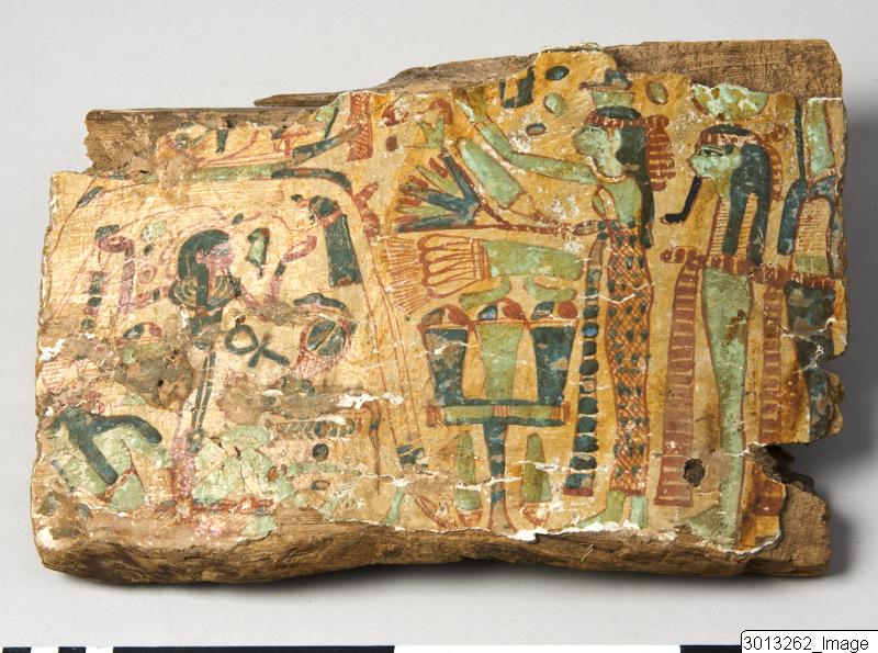 - Fragment from mummy coffin. Painted in different colours. Deir el-Bahri type. Image of the gods Geb, Nut, Shu and more. To the left can be seen one of the ancient Egyptian world views.