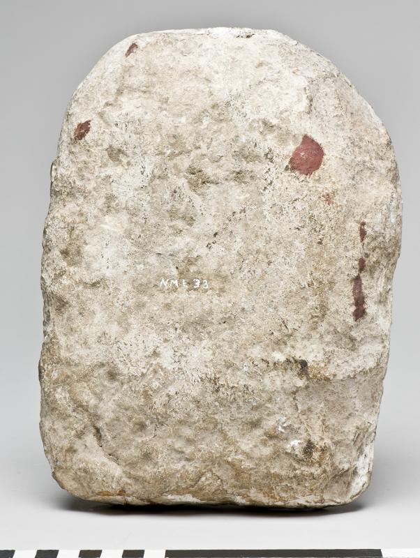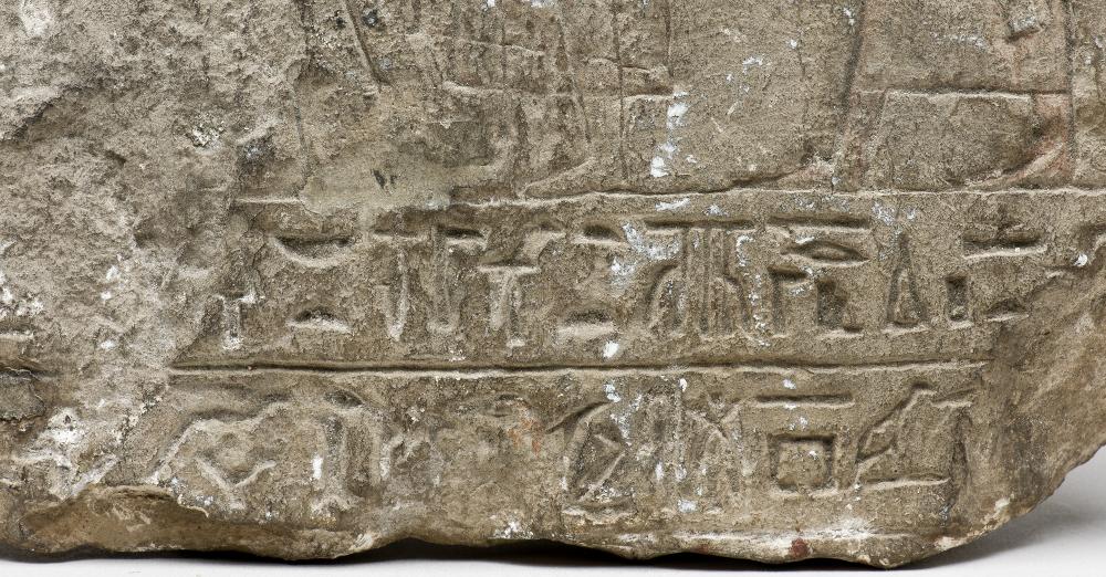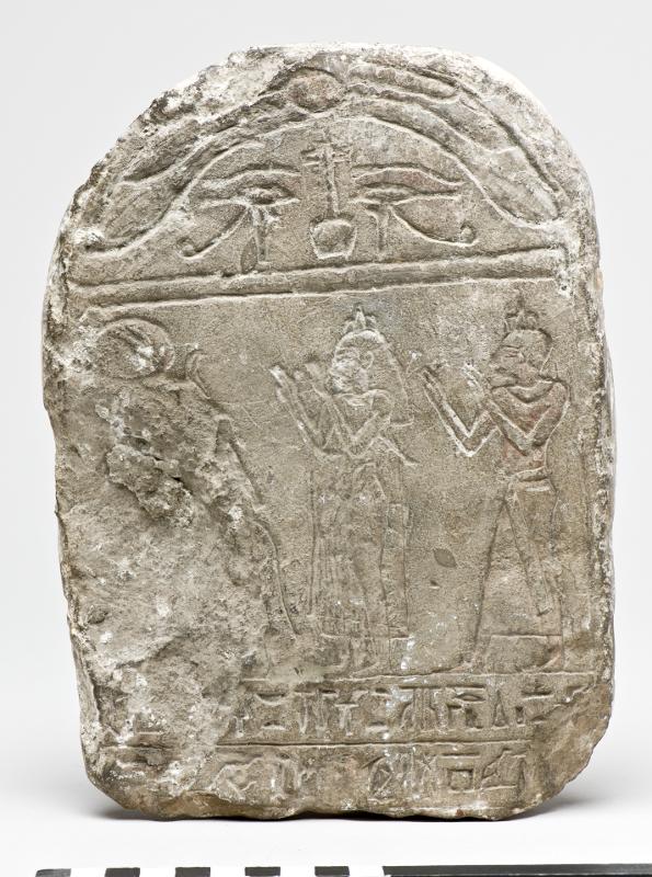 - Relief, stele, of stone with traces of red and white paint. A man and woman with hands raised in adoration in front of a seated god (damaged). Hieroglyphs.