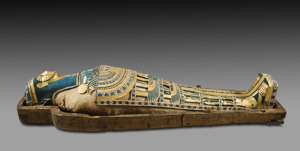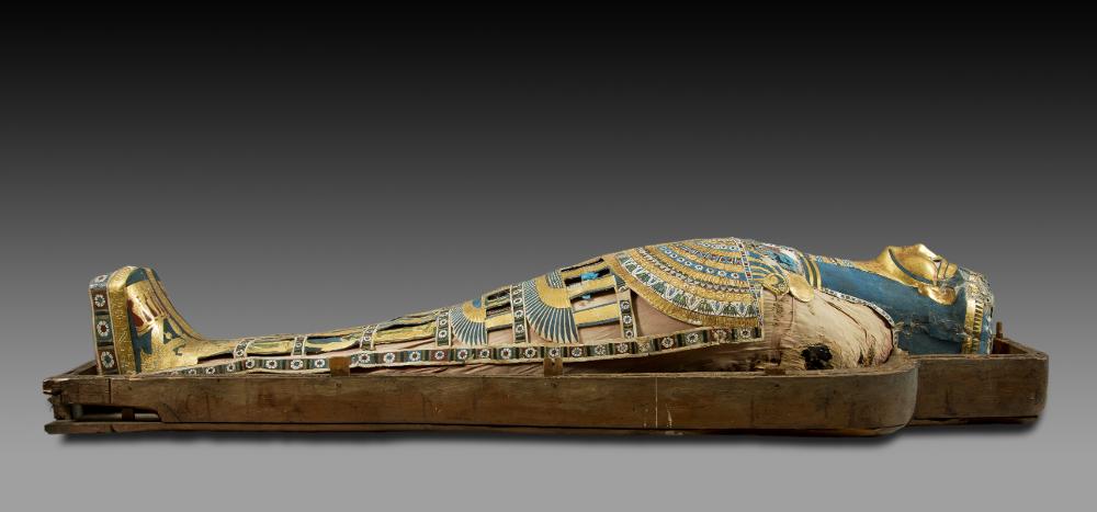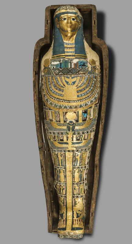 - Mummy of Neswaiu with kartonnage and beadnet. The mummys stomach was opened in 1962 for a tissue sample. X-rayed at S:t Eriks hospital by C. Sandström.
