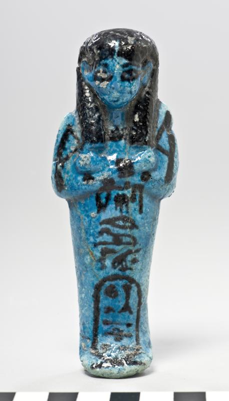 - Coarse ushebti with flat back. Blue glaze with black painting. hnwt-t3wy.