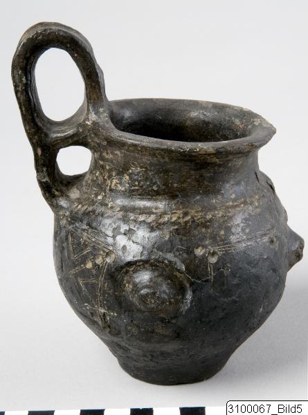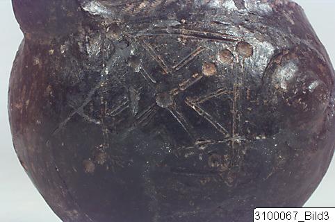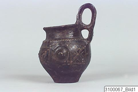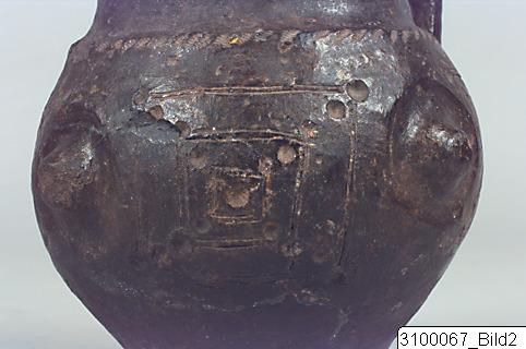 - Flat, horizontal rim; wide, concave neck; upper body bulging, lower body tapering downwards; raised, vertical band handle with slightly raised sides and reinforcing strut from rim to shoulder; flat base. Brownish to black impasto; burnished surface; plastic and incised decoration. Inside rim at handle attachment low ridge with rope pattern; rope pattern marking shoulder; on body three rounded knobs, surrounded by shallow depression; between knobs incised double-contoured rectangles, one filled in with two double-contoured rectangles and a cross formed by impressed dots, two filled in with a St. Andrew’s cross and impressed dots (one rectangle missing).