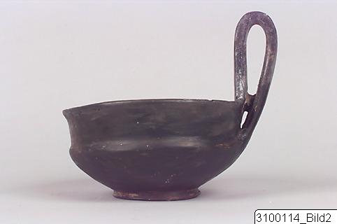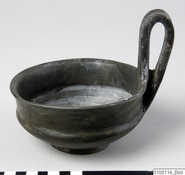 - Slightly everted rim; straight lip, offset from lower body; rounded bowl; thick band handle from rim to body; ring base. Buccheroid impasto with light grey core, greyish, rather lustrous surface.