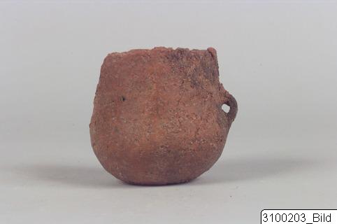 - Plain rim; wide, cylindrical neck running into line of body; convex body; lug handle on mid-body; flat base. Coarse, reddish to brown clay; burnished surface.