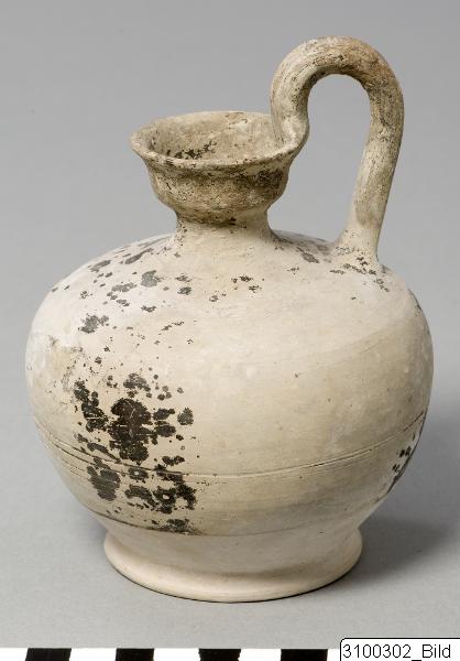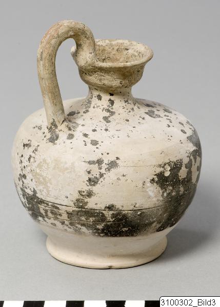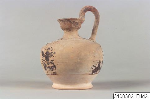- Deep, round mouth with everted rim, concave profile; short neck with concave profile; shoulder rather sharply set off from body; rounded body; raised, vertical, grooved handle from rim to shoulder; low, flaring base. Buff clay; lustrous, black paint. Originally entirely painted (?), but no traces of paint on lower part o body; four incised lines encircling mid-body; brown line encircling lower body.