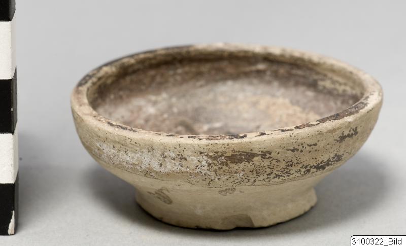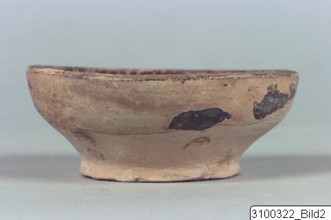 - Plain rim; upper body rounded, lower part conical; raised base. Buff clay; lustrous, black paint. Interior black; exterior: upper part of body black, lower part reserved, but with some black blobs.