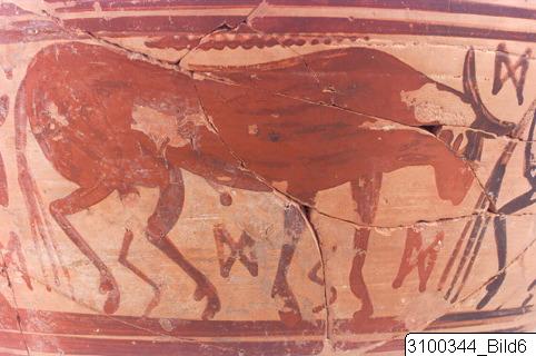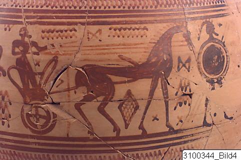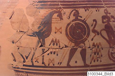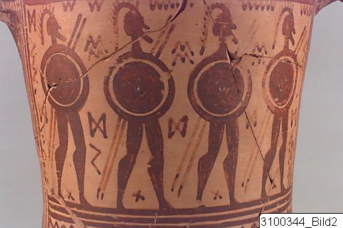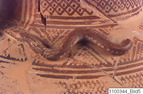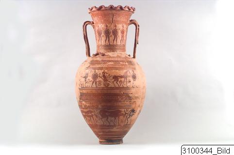 - Thickened, rounded rim; tall, splaying neck; tall, ovoid body; vertical band handles with extra rolls on each side from upper neck to shoulder; moulded ring base. Yellowish to light brown clay; semilustrous, black paint, largely misfired to brown or red; added white paint. Plastic decoration: one snake with modelled head curling on one side of rim, one on each handle and one on each side of shoulder. Inside of rim encircled by three bands; snake on outside of rim painted with white dots; below snake, on rim, seven opposed triangles; zigzag line encircling rim; on both sides of neck a panel with hatched meander, framed by triple lines; on both sides of neck large panel with warriors (four on front side, on back side three plus a fourth figure without shield or spears, with only a shield and a sword), facing right, with crested and plumed helmets, two spears each and circular framed shields covering their upper bodies - opposed triangles, sigmas and W’s, piled M’s, crosses and wavy lines as filling ornaments; below figured panel three-tiered, dotted lozenge pattern framed by triple lines; snakes on handles painted, white dots; horizontal strokes framed by vertical lines on rolls of handles; on each side of snake on handles opposed, cross-hatched, framed triangles; snakes on shoulder painted, white dots; above and below snake cross-hatched, opposing framed triangles; below this two zones with lozenge chains and one with checkers, separated by horizontal lines; on belly frieze with warriors with crested and plumed helmets, two spears each, large circular, framed shields alternating with one-wheeled chariots drawn by a single horse and driven by an unarmed figure - W’s, wavy lines, opposed triangles, birds, piled zigzag lines, cross-hatched lozenges and crosses as filling ornaments; below this two zones with lozenge chains and one with checkers, separated by horizontal lines as above; on lower body frieze with bulls, facing right - zigzag lines, opposed triangles and sigmas as filling ornaments; below bull frieze horizontal bands and zone with vertical strokes; base painted.