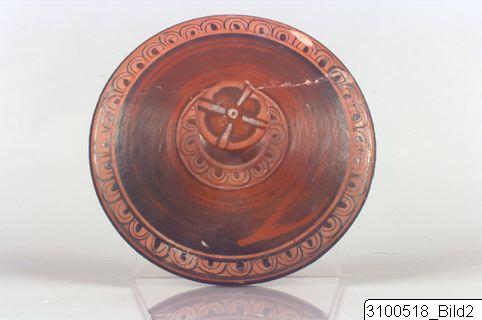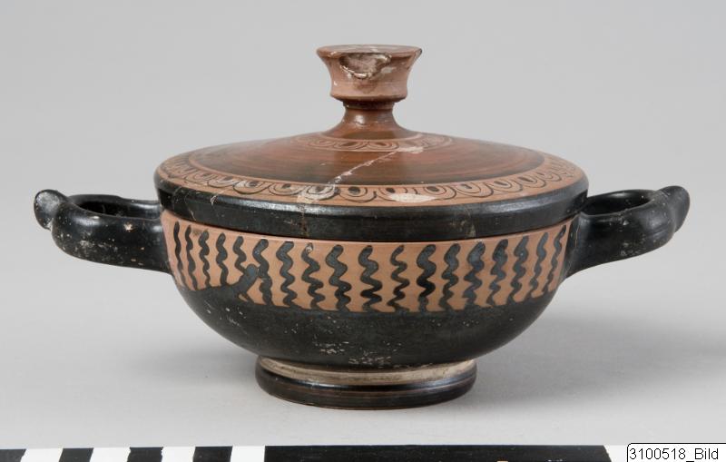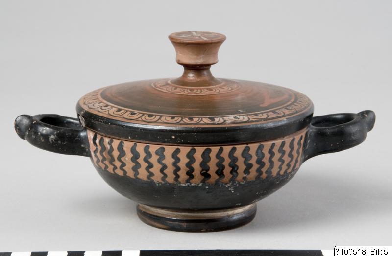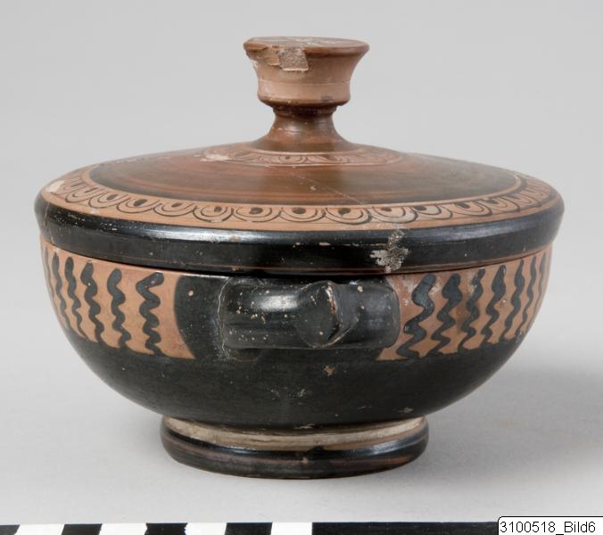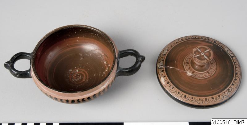 Lid: profiled knob on short stem; sloping top surface; slightly inverted rim. Red clay; black glaze, largely misfired to red; added black and red. On knob top a rosette and a superimposed cross; edge of knob reserved; ovoli around base of knob and around outer part of lid; bottom reserved.
