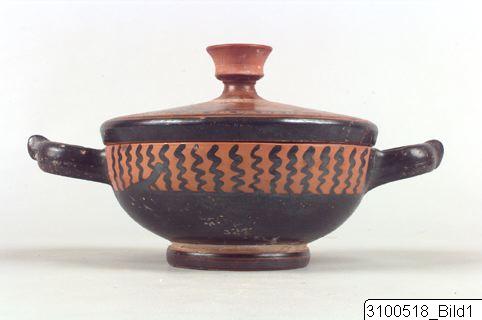 Bowl: short rim, offset from body; depressed semiglobular body; horizontal, flattened handles with triangular protuberance at the end; ring base. Red clay; black glaze, misfired to brown and red on inside. Interior and exterior painted, except reserved panels in handle zone with vertical, wavy lines and groove immediatly above base; bottom reserved with two bands and a central dot.