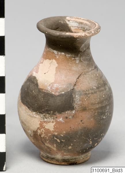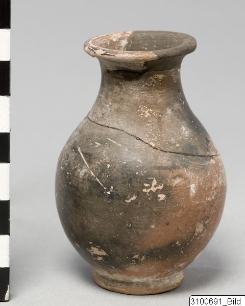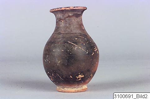 - Round mouth with thickened, everted rim; concave neck; ovoid body; disc base with concave underside. Reddish yellow clay; black glaze, largely misfired to grey, brown and red. Parts of base and underside reserved.