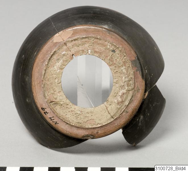 - Ridge encircling top; torus base. Reddish brown clay; black glaze; brown slip. Exterior black with a reserved band on lower part; interior reserved.