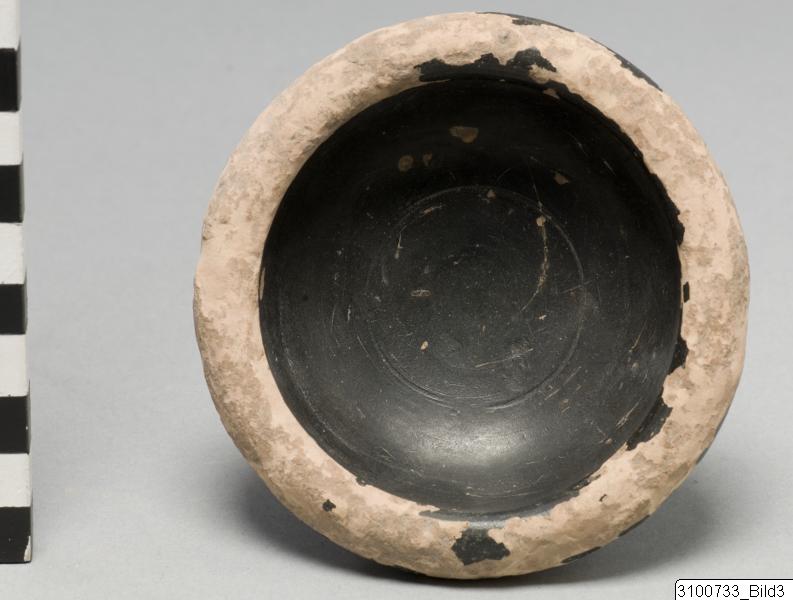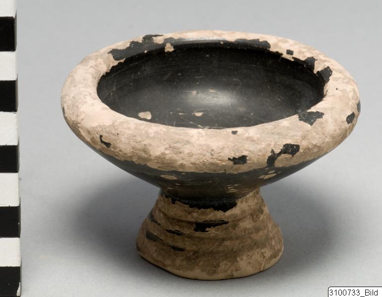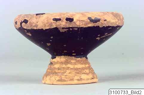 - Stemmed bowl. Inturned rim; conical body; horizontally grooved, conical base. Porous, reddish yellow clay; black glaze. Underside reserved.