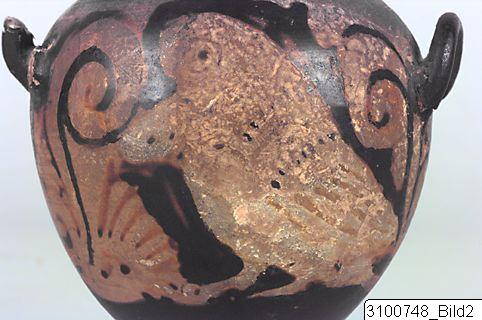 - Broad, moulded rim; narrow, concave neck; moulding at base of neck; piriform body; one flattened, vertical handle from neck to shoulder and two horizontal, canted handles below shoulder; flaring ring base; central nipple on underside. Red clay; black glaze, partly misfired. Mouth, upper part of neck and handles black; black tongues on neck; on shoulder a row of blobs between bands; on body a large owl flanked by scrolls; below vertical handle a large palmette; most part of underside reserved.