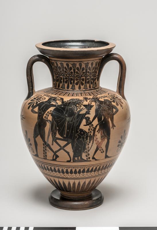 - Neck amphora. Torus shaped rim; splaying neck; a ridge at upper neck and one at junction between neck and shoulder; sloping, bulging shoulder; twin, triple, vertical handles from neck to shoulder; piriform body, tapering downwards; disc base. Pale red clay; black glaze, partly misfired to red; added red and white; incisions. Rim top, neck, inside of handles and body reserved; on neck a chain of double lotuses and palmettes, connected above and below by arcs; at base of neck alternating red and black tongues; A: Dionysos and (probably) Ariadne, seen in profile, are seated on a stool with animal legs; both wear red wreaths; the goddess wears a decorated chiton and himation, the skin of her face and hands is white; Dionysos holds up a kantharos; they are flanked by two dancing satyrs with red beards and tails, the one to the right wears a panther’s skin; in the background a grapevine. B: a young man (possibly Apollon) in dotted himation, red fillet and beard stands in a two-wheeled chariot drawn by four horses with red manes; behind the horses a woman in red fillet (Artemis?), and a deer; Hermes, in short red fillet, petasos, short chiton, mantle and boots, leads the horses. Beneath and beside handles four connected palmettes and three lotus flowers; black base line beneath figures; on lower body a chain of lotus buds and dots, framed by double bands above and below; further below a zone of rays and a black band; underside reserved. Graffiti on underside: ‘D’ above ‘I’ (or an arrow) plus a ligature of ‘L’ and ‘H’.