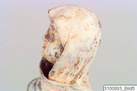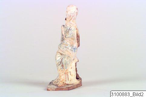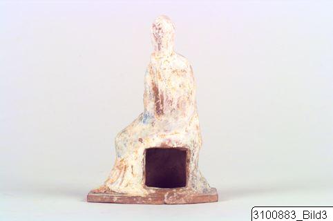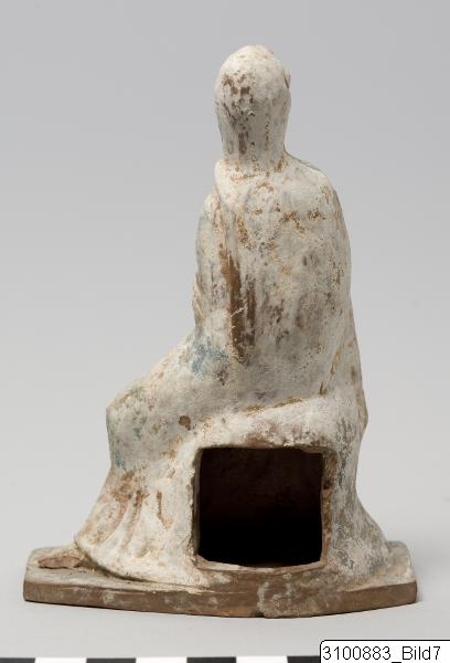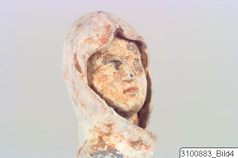 - Seated woman, wearing a blue and pink chiton and a himation of same colours that covers her head and body down to the knees; she sits on a rock (?) with crossed legs, only one foot visible; her head and upper body are turned to the right, she holds up her right hand under the himation, while the left one is completely hidden; on the backside part of the himation hangs down and there is a square opening in the ‘rock’; mounted on a roughly rectangular, perforated base. Brown clay; white, blue and pink paint.