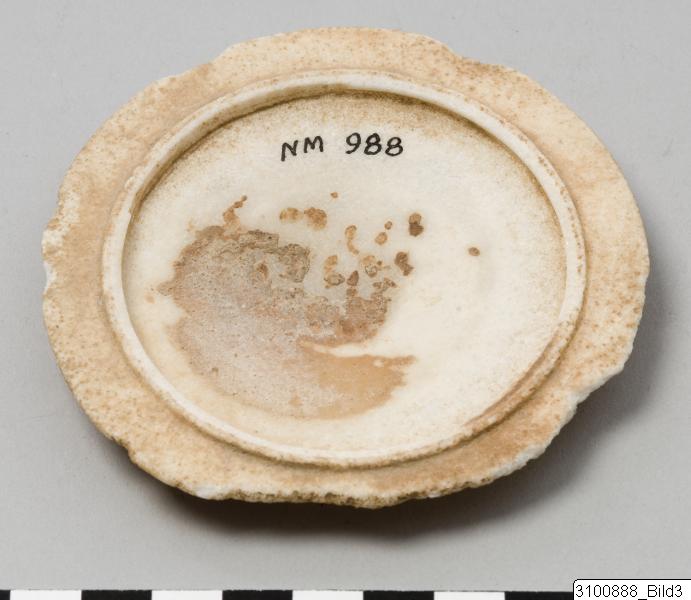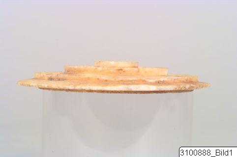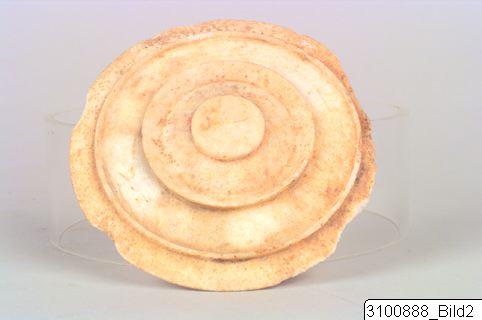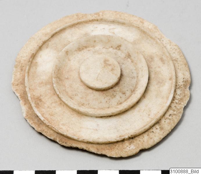 - Lid for a pyxis. Slightly domed; two ridges encircling top; flat knob; flange on underside. Yellowish to white stone.
