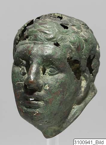 - Head of a young athlete (probably a boxer), tilted to the left; he wears a cap made of leather straps over the short and curly hair; the ears are slightly swollen; his nose is straight and the lips are slightly parted. Hollow. Small, flaring rim at base of the head.