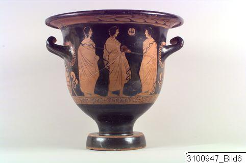 - Bell krater. Wide mouth with overhanging rim; rather slender body, curving out above handles; rolled-back, horizontal handles at upper body; lower body tapering to a stem; grooved base. Pinkish to pale brown clay; black glaze; reddish brown wash; added yellow paint. One reserved band on inside of mouth and one on rim top; on outside a reserved laurel branch between bands; A: in the centre of the picture Apollon, standing in three three-quarter view, his head seen in profile; he wears a yellow wreath, a decorated cape, sandals, a broad belt with yellow circles and a richly decorated musician’s chiton with long sleeves, embroidered with stars, palmettes, chevrons, cable pattern and the picture of a figure on horseback; he holds his partly white kithara erect (by a strap around his left wrist), stopping the strings with the fingers of his left hand; he holds a plektron in his right hand; a decorated scarf hangs down from the kithara; to the right of Apollon a woman standing in profile, holding on to the kithara with her both hands; she wears a fillet, a stephane, a necklace, bracelets and a loose peplos; to the left of the god a woman, seen in profile, seated on a stool – details on the stool are marked with yellow dots or strokes of diluted glaze; her feet are resting on a small footstool; she is playing a small harp, and holds a plektron in her right hand; she wears a yellow wreath, a decorated chiton, bracelets and sandals; her hair is tied up with a yellow fillet; B: three standing youths in himatia; in the upper field to the right a pair of stylized jumping weights; below figures an encircling border of meanders and saltire squares; handle panels reserved; rays at base of handle attachments; below both handles a palmette within an arc flanked by flowers; two reserved bands encircling base; underside reserved.