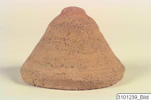 - Moulded breast; domed with large nipple at top; roughly circular opening on underside. Reddish yellow clay with large inclusions.